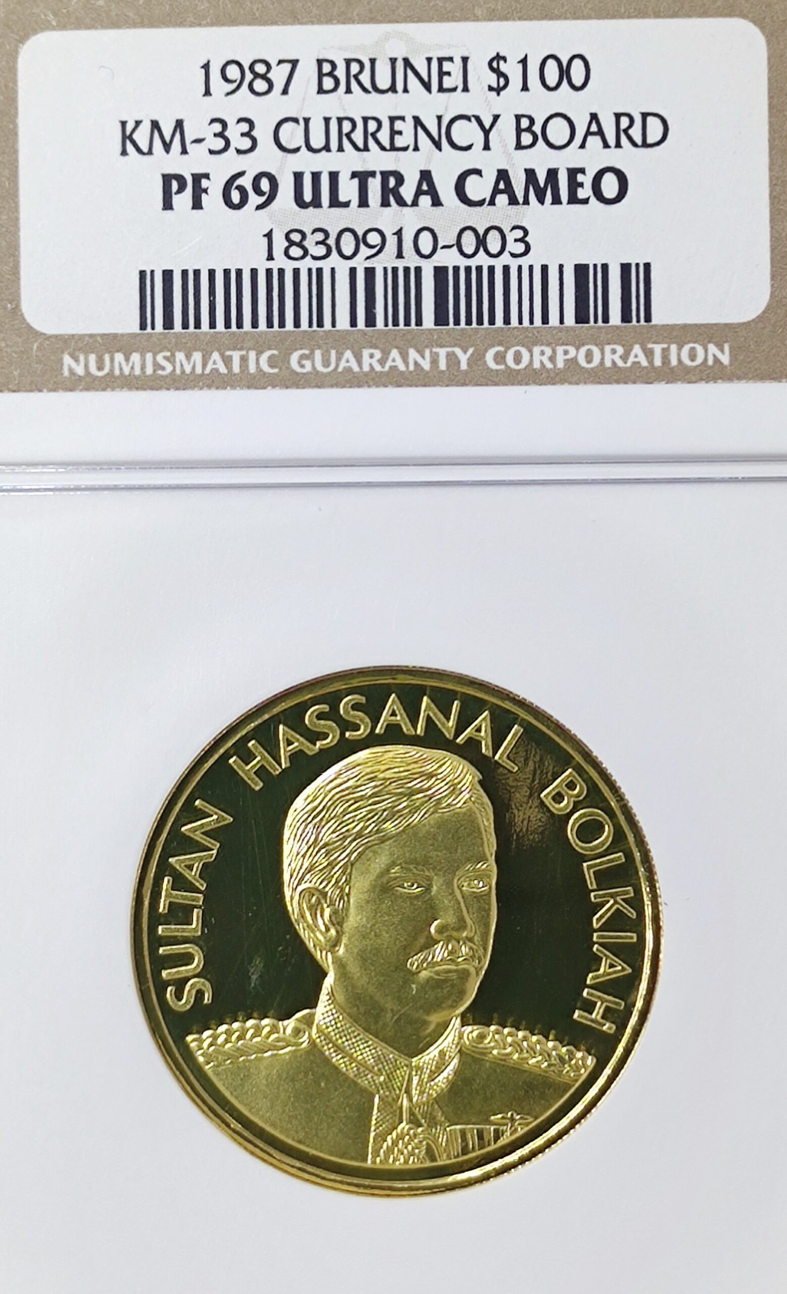 Sell 2,178.45 €The 100 Dollars Brunei Hassanal Bolkiah gold coin commemorates 20th Anniversary of Brunei Currency Board.
