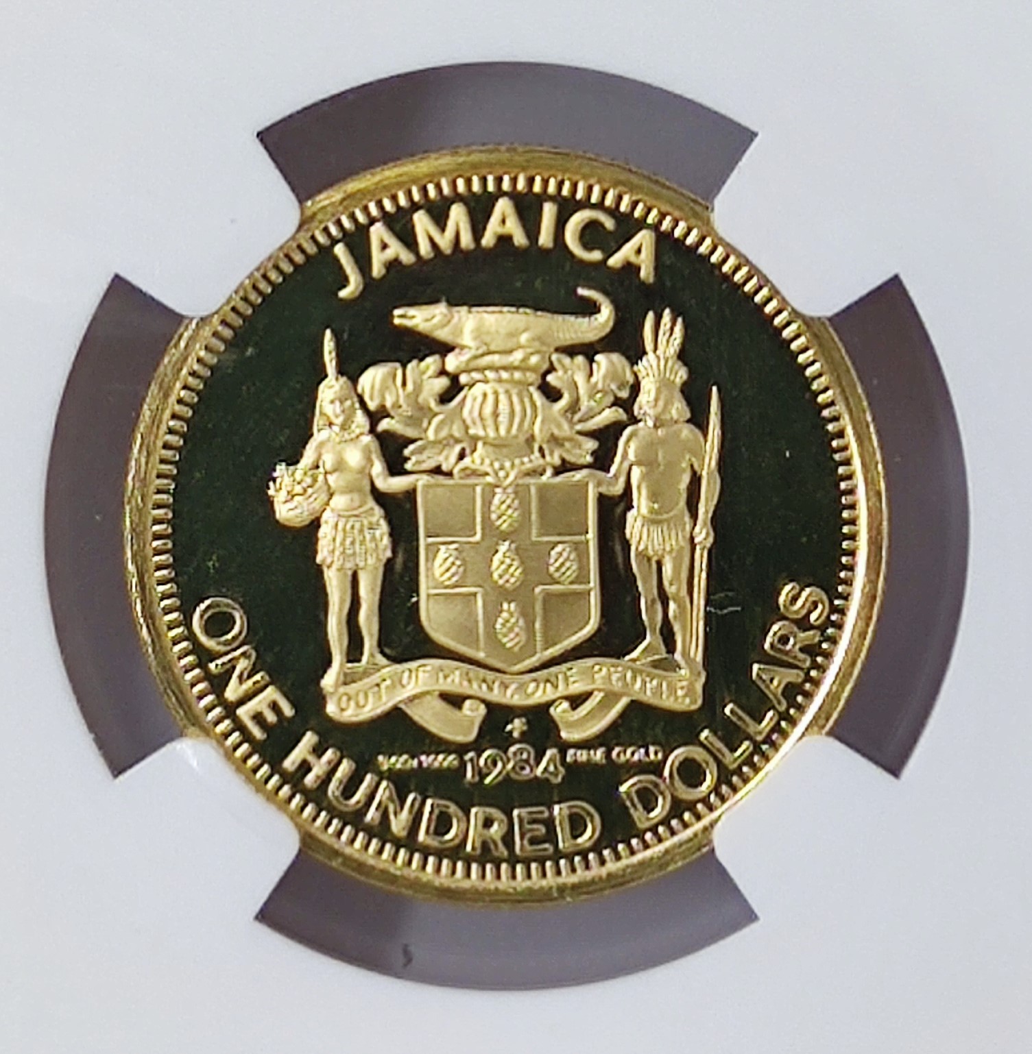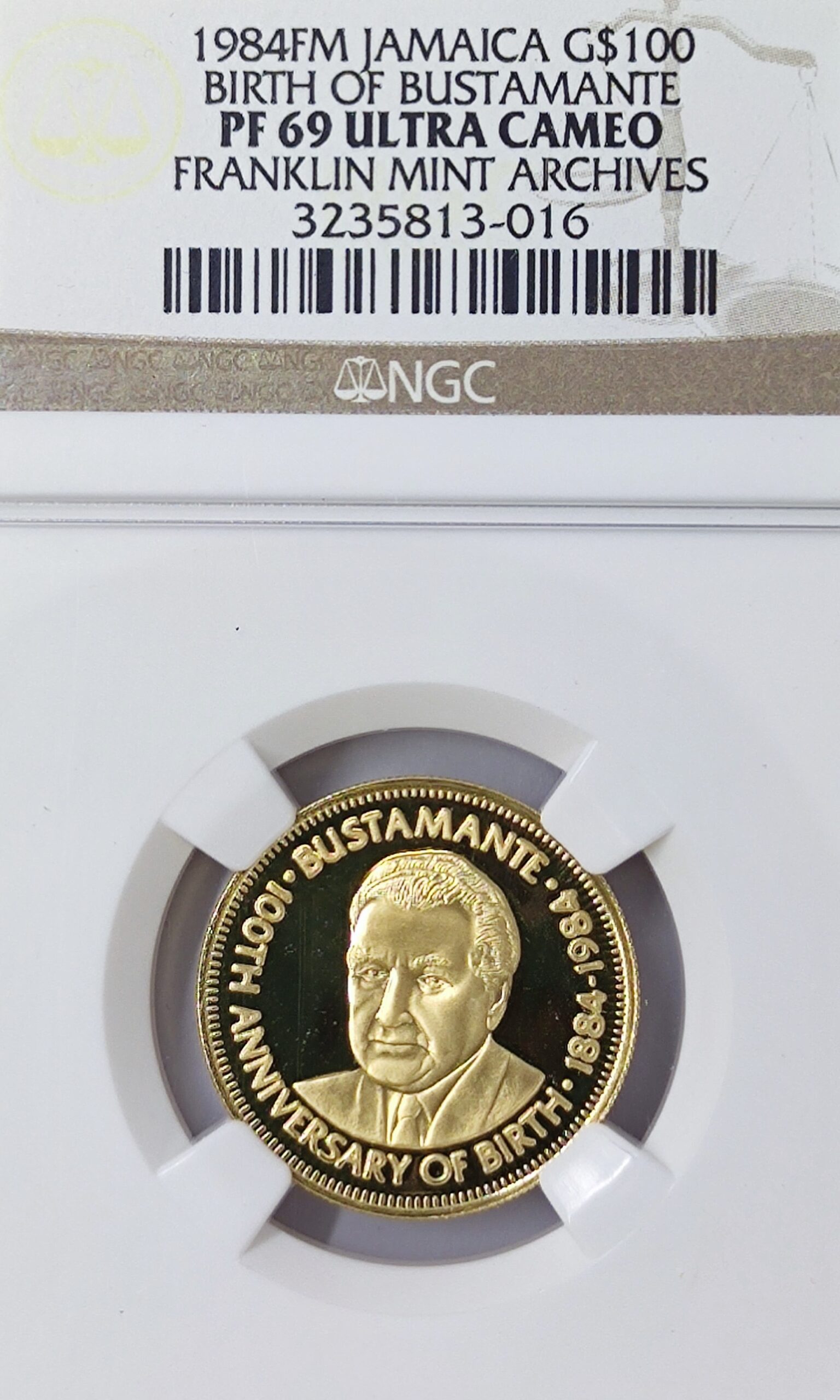 Sell 1,129.70 €The 100 Dollars Jamaica Birth of Bustamante gold coin commemorates the centenary of Sir Alexander Bustamante, a prominent political figure and the first Prime Minister of independent Jamaica, on the occasion of his 100th birthday.