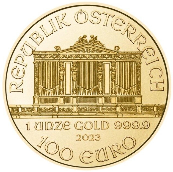 Obverse features a pipe organ from within the Musikverein, a concert hall in Vienna. The words REPUBLIK OESTERREICH (Republic of Austria), 1 UNZE GOLD 999.9 (1 ounce pure gold), 2023 and 100 EURO are also minted on the obverse.