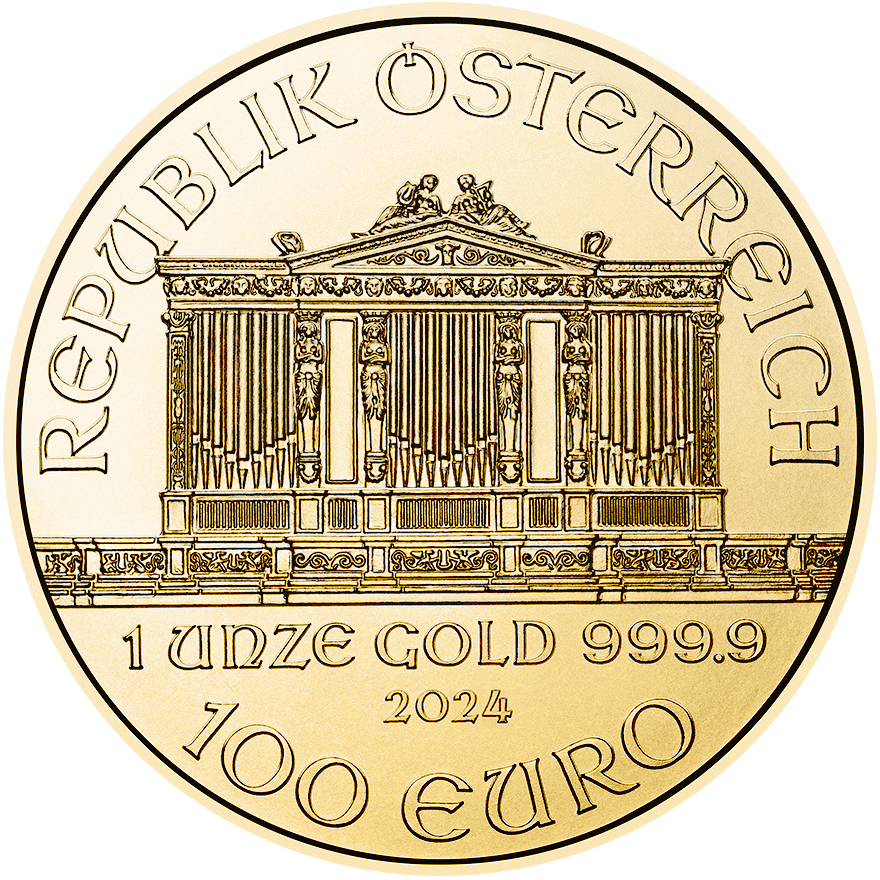 These coins feature instruments used by the Vienna Philharmonic on the reverse and an image of the Vienna concert hall on the obverse. The face value on the 2024 1oz gold Philharmonic coin is 100 Euros, with a purity of 999.9 fineness.