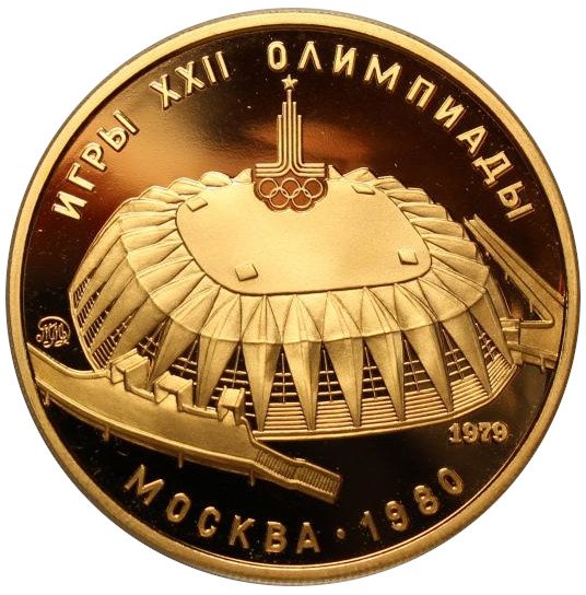 Reverse: top along the cant the words "Games of the XXII Olympiad", below left the monogram of the mint "MMD", in the middle the sports hall "Druzhba", below right the year of issue of the coin "1979", below at the edge of the coin separated by a dot the word "MOSCOW" and the year of the XXII Olympiad "1980".
