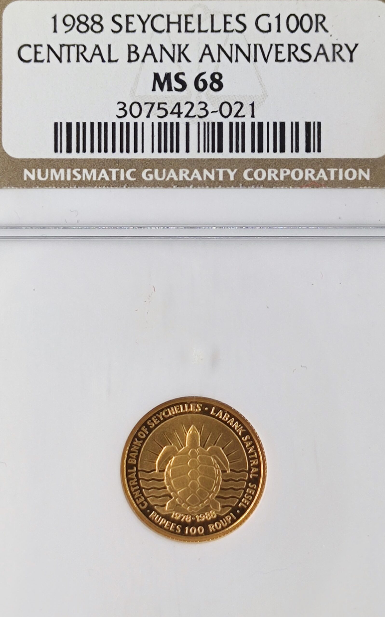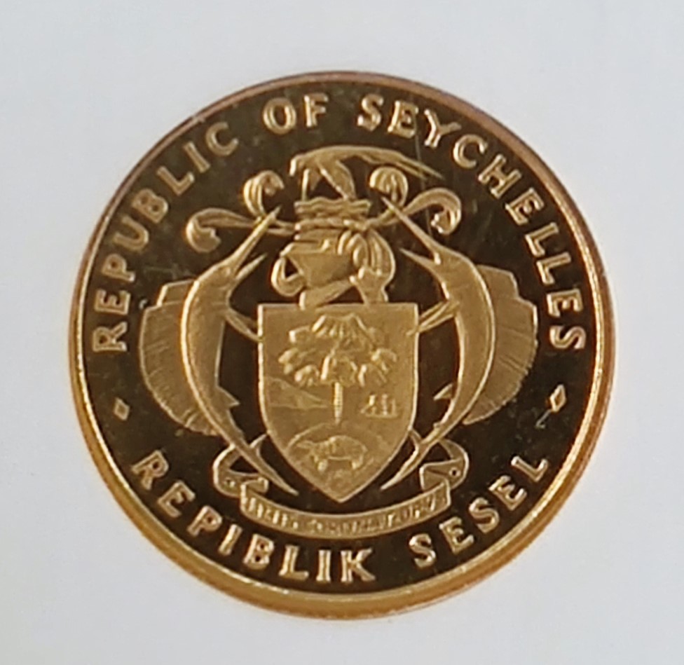 Sell 234.56 €The 1988 100 Seychelles Rupee Gold Coin commemorates 10th Anniversary of the Central Bank.
