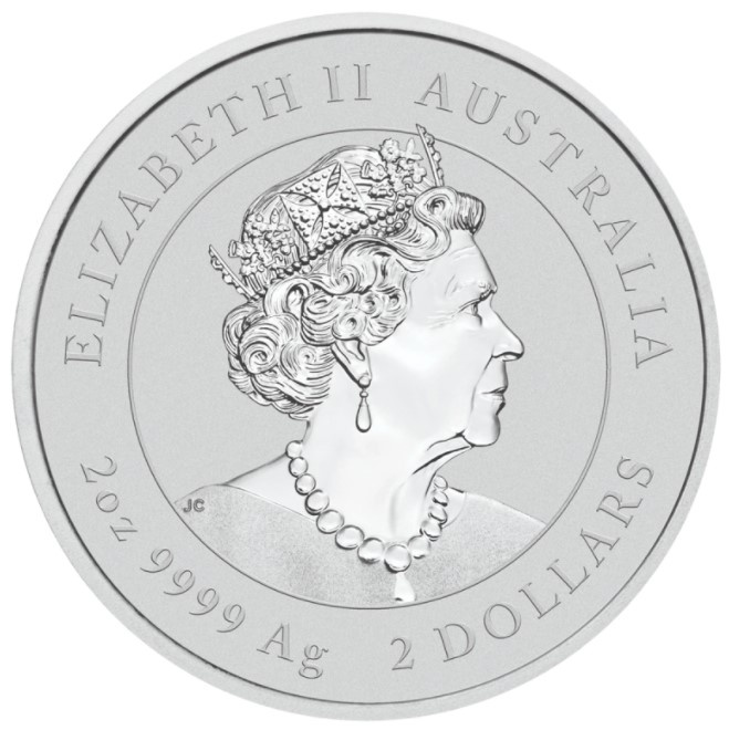 The obverse side of the coin has Queen Elizabeth II in profile facing right in Jody Clark’s now famous artwork. The queen looks stately wearing her diadem crown and adorned in her royal jewels. Above her head is ‘Elizabeth II Australia’. Below her is ‘2 oz. 9999 Ag 2 Dollars’. Jody Clark’s initials ‘JC’ can be seen on the left of the queen’s dress.