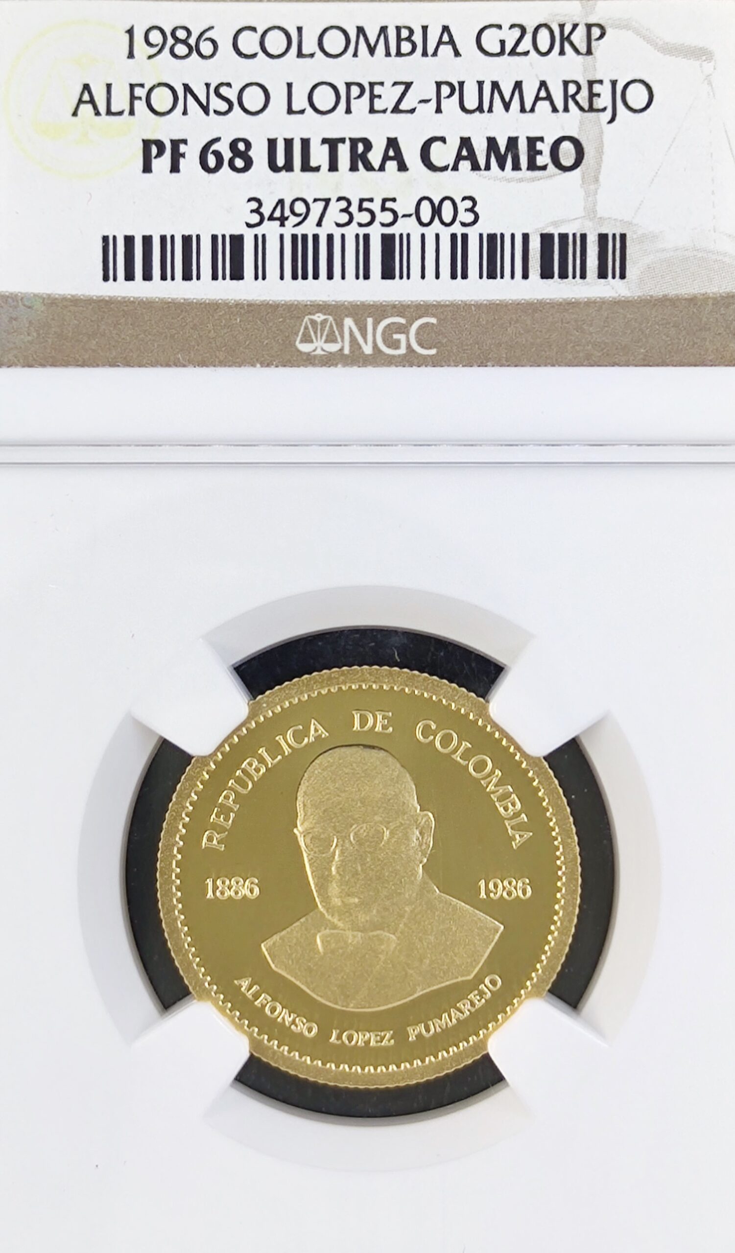 Sell 1,161.85 €The 1986 Alfonso Lopez-Pumarejo Gold Coin honors 100th Anniversary of the Birth of Alfonso Lopez-Pumarejo, a prominent figure in Colombian politics and a two-time President.