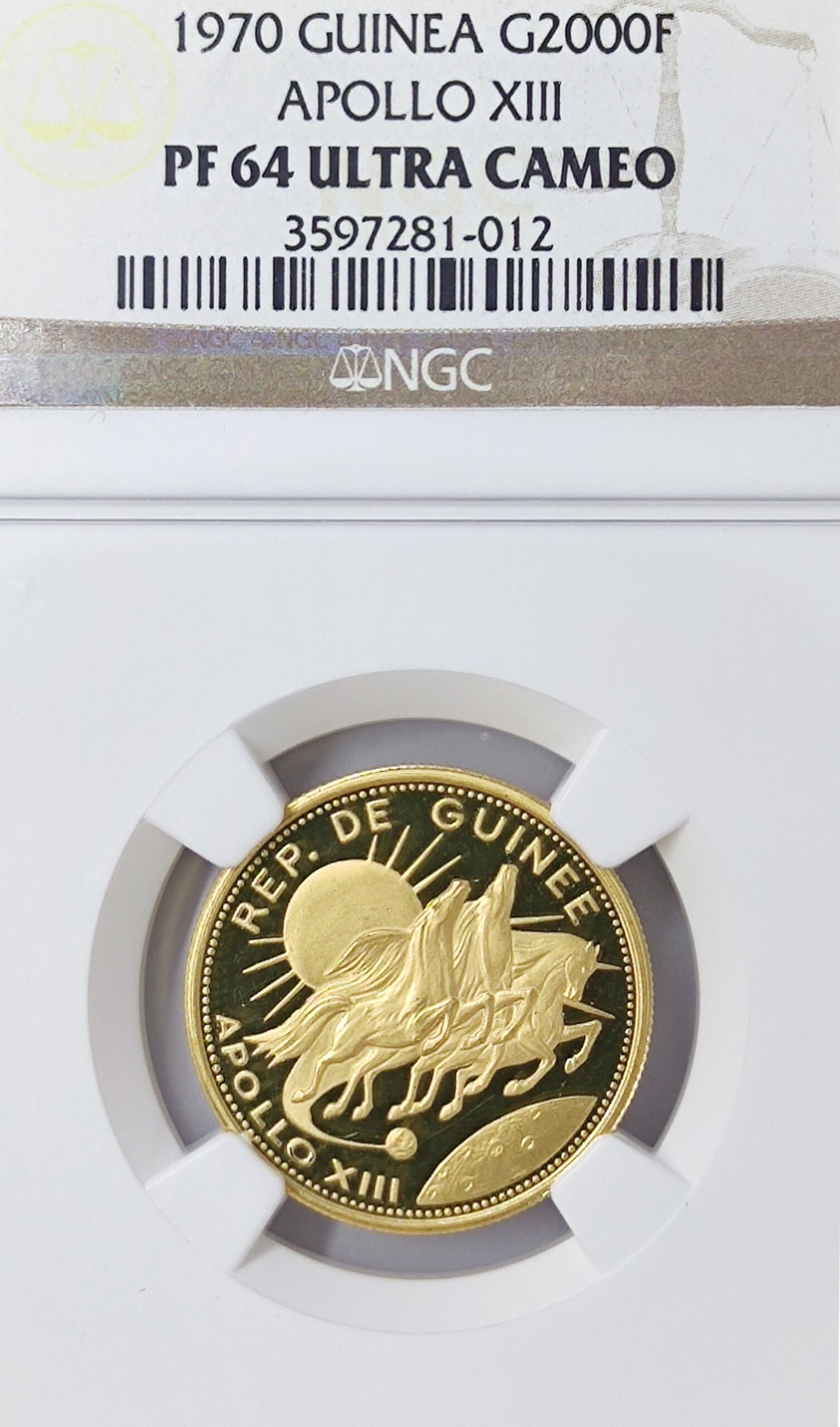 Sell 1,102.24 €The 2000 Francs Guinea Apollo XIII gold coin commemorates the Apollo 13 space mission in 1970, a significant event in space exploration history.
