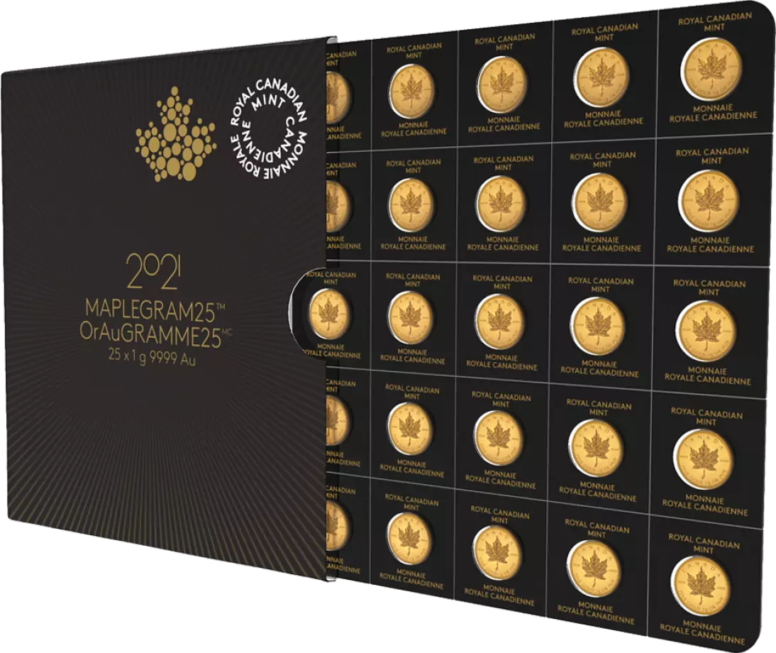 Sell 3,620.05 €The Maple Leaf is the official bullion gold coin of Canada, and is now available in a pack of 25 x 1g 2023 ‘MapleGram’ coins minted in 999.9 gold.