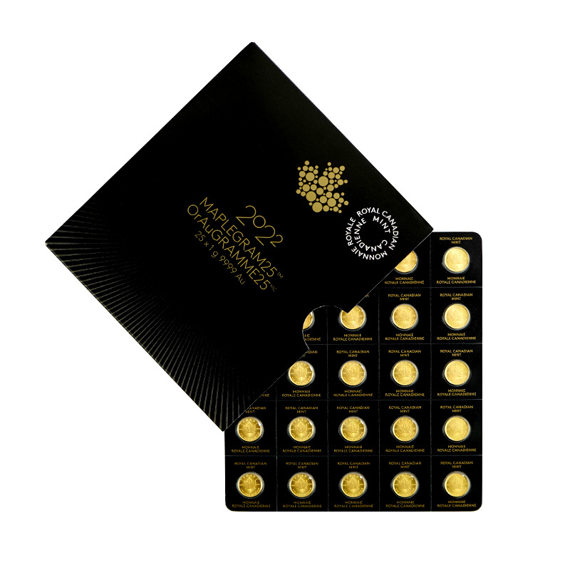 The 2023 MapleGram 1g x 25 gold coins are a very unique purchase and offer an interesting mix of small units, with a reduced premium than buying individually. Packaged in a unique set, each of the coins can be removed and divided into singles thanks to a dividable blister pack. Every coin has its own minting as well as its own individual serial number on the backside of the packaging.