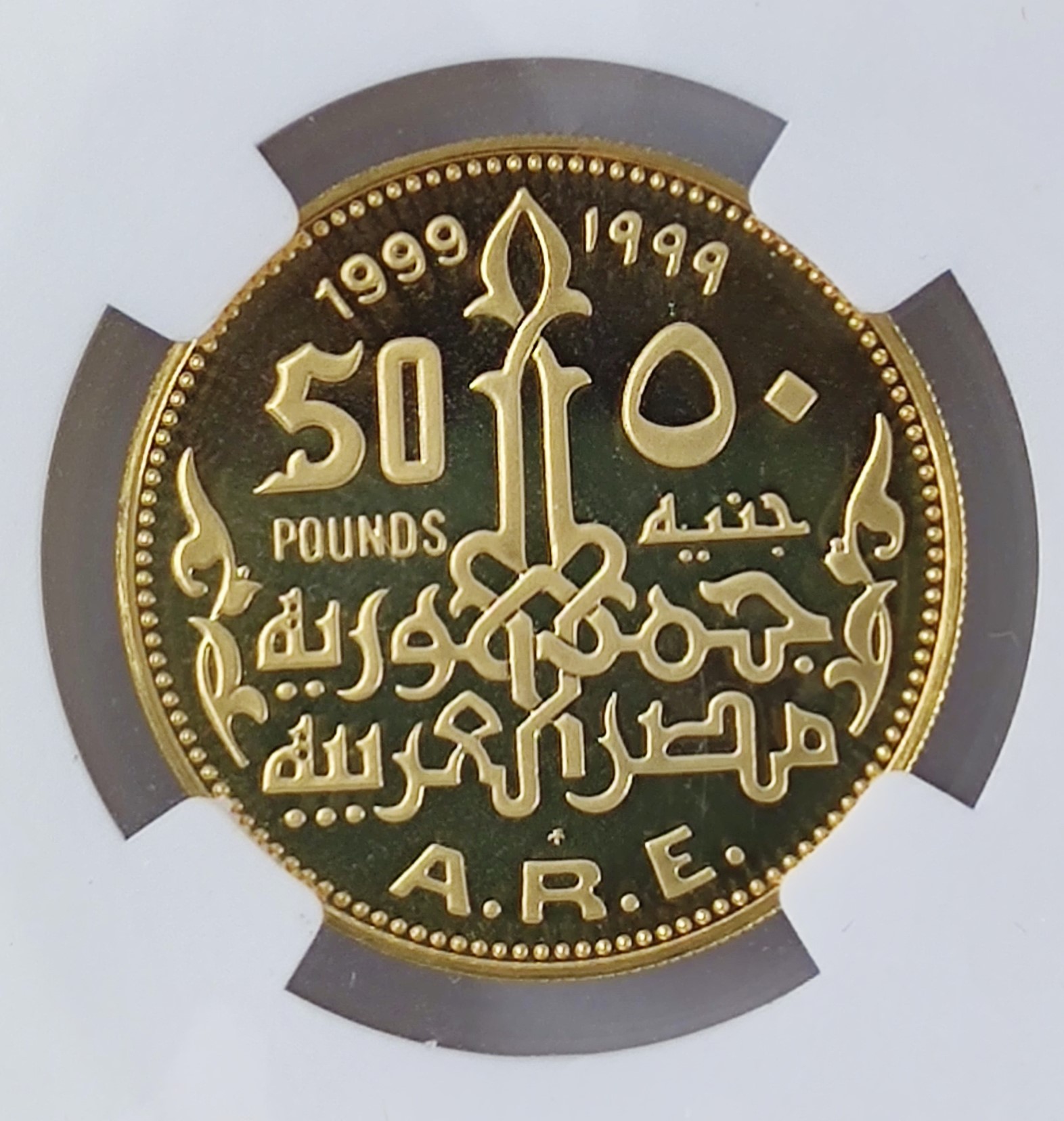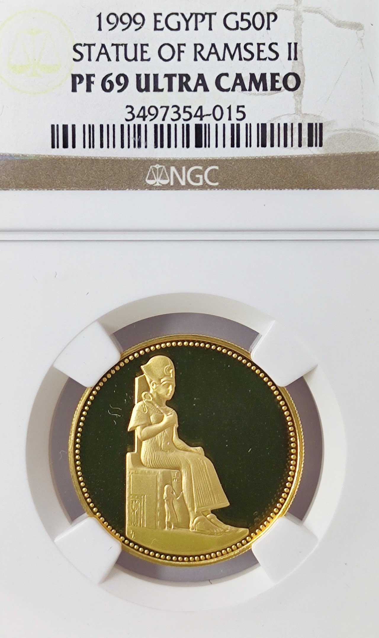 Sell 1,856.33 €This gold proof was a one year type issued by Egypt in 1999 to pay tribute to Ramses II, who reigned as Pharaoh from 1279-1213 BC.